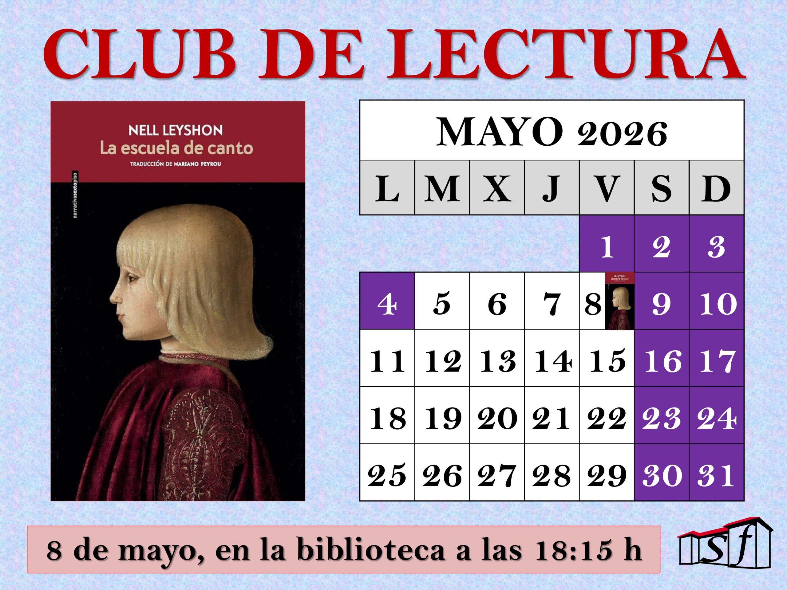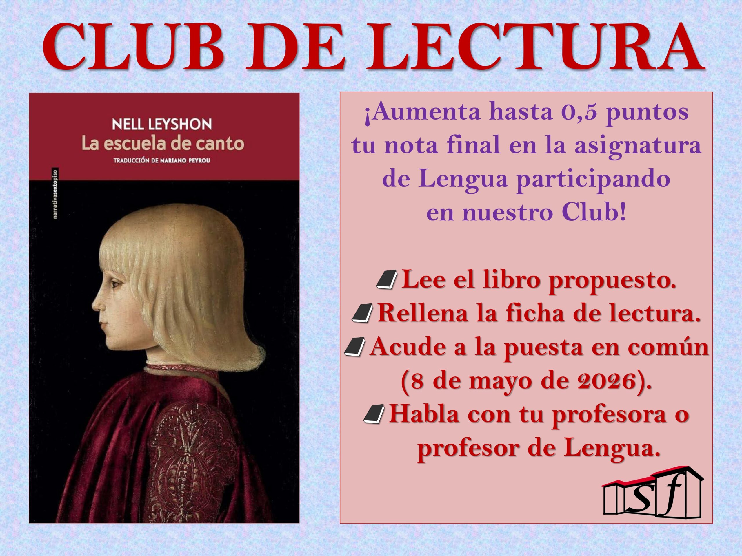 Club de lectura – La escuela de canto. Biblioteca las 18:15h. 12 marzo, 2026 0 Noticias, Club de lectura VIERNES 8 de MAYO, BIBLIOTECA a las 18:15h. Aumenta hasta 0,5 puntos tu nota final de Lengua, participando en nuestro Club.