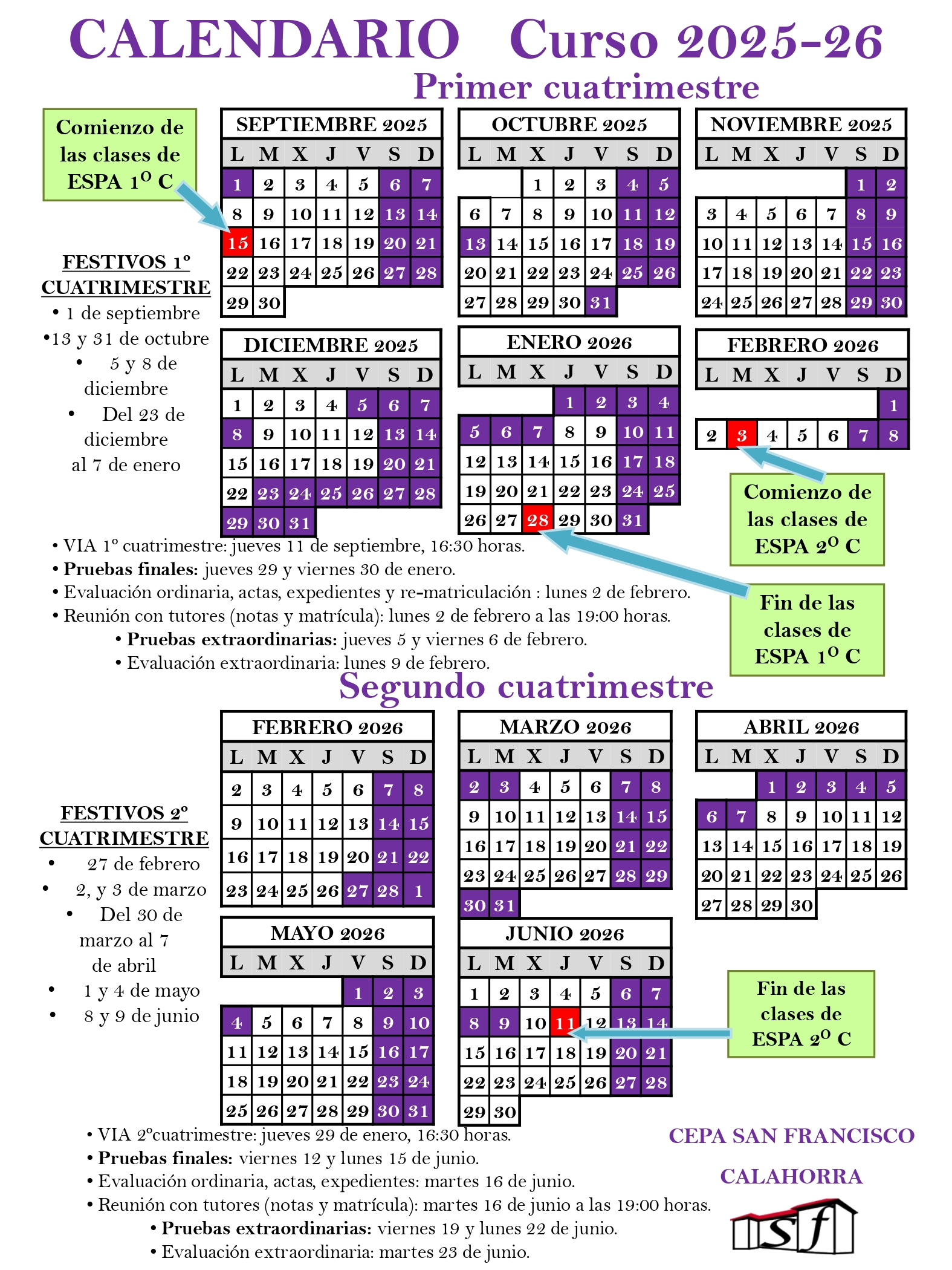 Calendario cuatrimestralPara las enseñanzas de ESPA, ESPA a DISTANCIA e INGLÉS 1, 2, 3, 4 |
