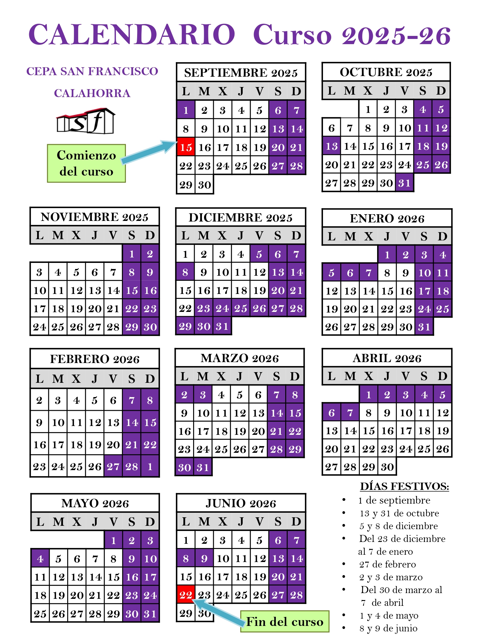 Calendario anualPara el resto de las enseñanzas (consultar OFERTA EDUCATIVA) |