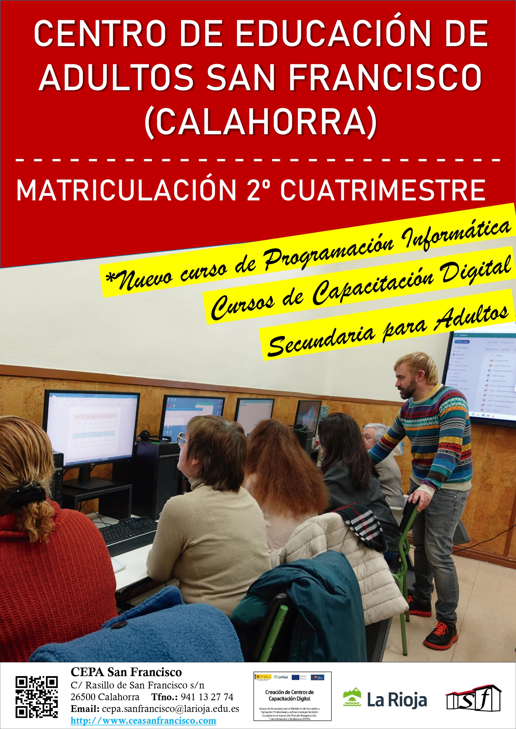 - Información de matrícula en el 941 13 27 74, enviando un WhatsApp al número 682 71 51 49 o escribiendo un correo electrónico a la dirección cepa.sanfrancisco@larioja.edu.es
